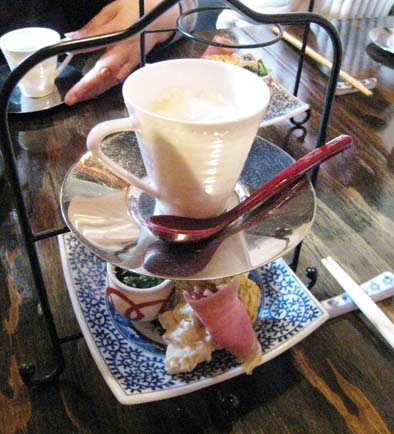 アフタヌーンティーのティースタンドみたいなトレイにお豆腐と前菜などなど。