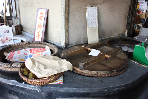 店名“大やきいも”の名のとおり、年期の入った大きな釜で芋が焼かれてる